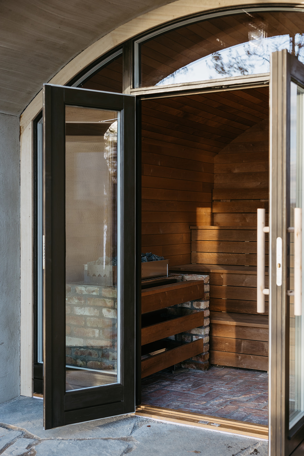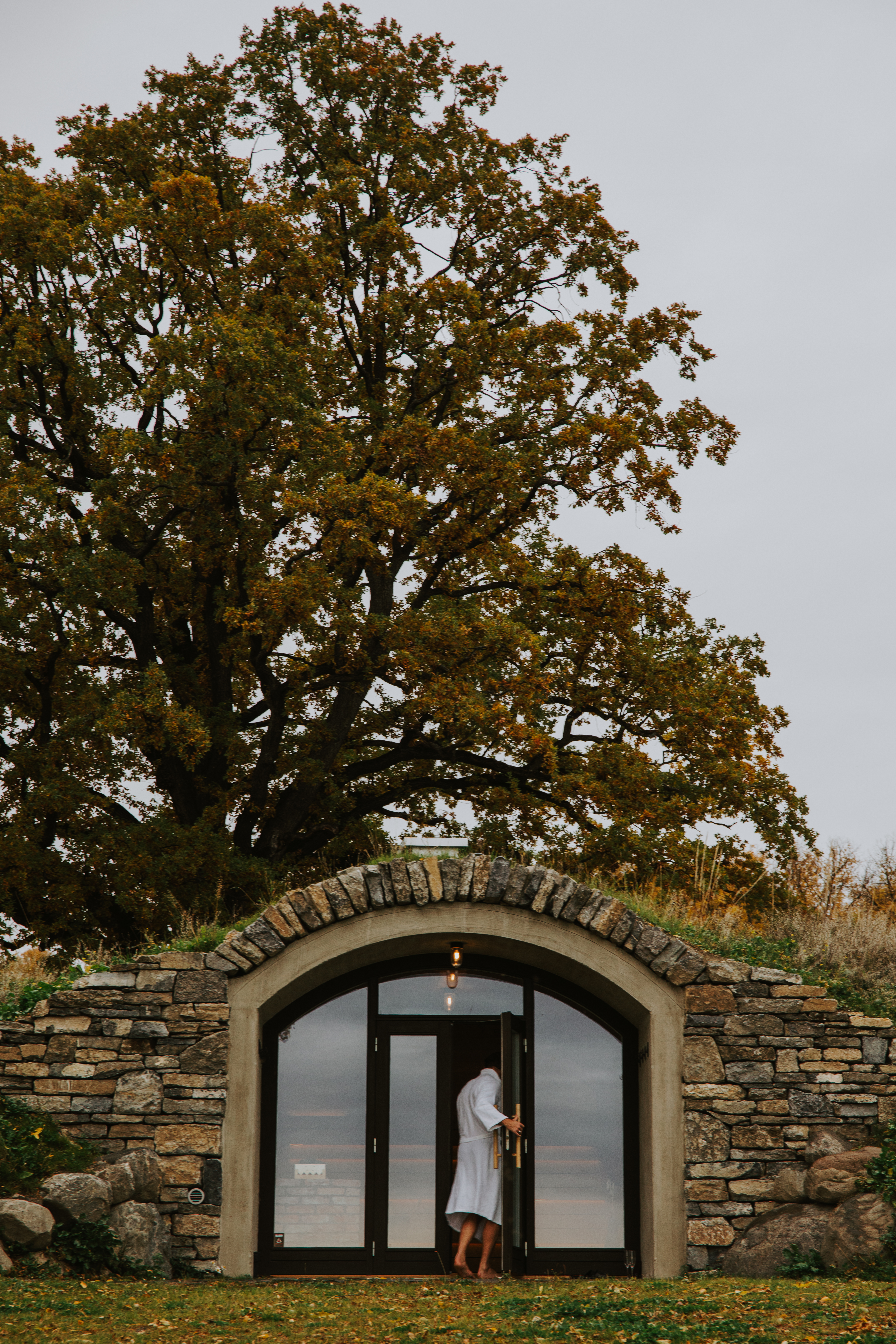 The sauna adjacent to the bathhouse is inspired by the farm's own potato cellar and is somewhat reminiscent of a built-in vault/grotto that blends perfectly into the terrain. The sauna connects you closely to nature and Lake Mjøsa.